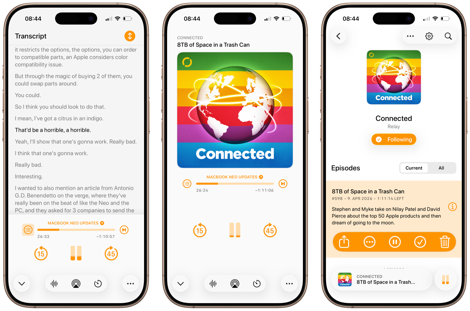 Luister je met Overcast naar een podcast, dan kun je sinds versie 2026.4 vanaf het infoscherm swipen om mee te lezen met wat er wordt gezegd. Houd je deze pagina geopend, dan merk je dat de app automatisch van regel naar regel gaat op het tempo van de spreker. Zo houd je op spreektempo bij wat er wordt gezegd, ook als je niet kunt luisteren. Ook handig: de app herkent muziek, dus je zult bij het lezen van de transcriptie niet in de war raken van muziekteksten. Is een aflevering nog niet getranscribeerd, dan kun je dat handmatig laten doen, mits de taal wordt ondersteund en je iPhone op iOS 26 of nieuwer draait.
