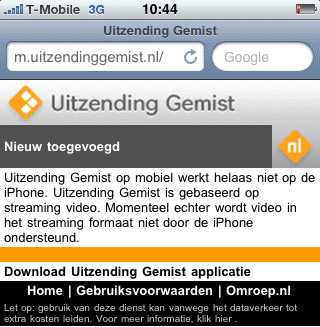 Er is een mobiele versie van Uitzending Gemist, zowel een mobiele applicatie als een mobiele website, beide niet geschikt voor de iPhone. De enige partij die daar iets aan kan doen is Apple.