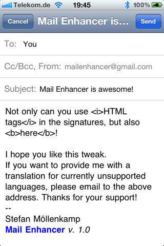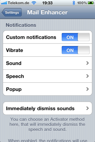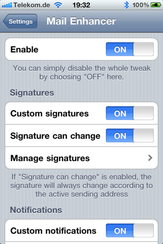 De tweak Mail Enhancer voegt een aantal functies toe aan de standaard e-mailapplicatie in iOS. Zo is het mogelijk om per e-mailadres een handtekening in te stellen die ook HTML kan bevatten. Daarnaast is het met Mail Enhancer mogelijk om zelfgekozen notificaties te ontvangen bij binnenkomende e-mail (vibratie, popup, ringtone of spraak). Wat betreft spraak kun je jouw toestel aan laten kondigen van wie je (en hoeveel) e-mail(s) hebt ontvangen. Je kunt ervoor kiezen om het geluid of de spraak ook te laten horen als je het toestel op stil hebt staan of kunt de spraak alleen laten horen als je een koptelefoon gebruikt. Met behulp van een zelf in te stellen gebaar in Activator kun je eenvoudig geluid/spraak in- en uitschakelen. Mail Enhancer is te gebruiken op iOS 4.0 en hoger en is in te stellen via het menu Instellingen.