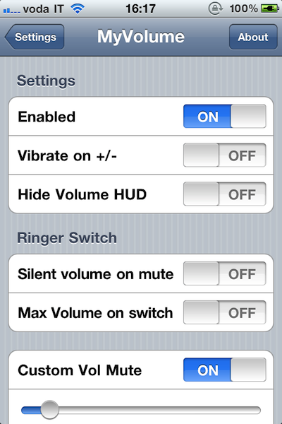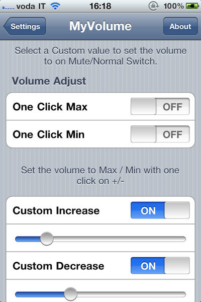 Met MyVolume kun je toegang krijgen tot allerlei extra opties met betrekking tot het volume van je iPhone, iPod touch of iPad. Zo kun je zelf kiezen hoe veel het volume wijzigt als je op de volumetoetsen drukt of een waarde voor het volume instellen voor als je het geluid van je toestel aan- of uitzet. Daarnaast is het mogelijk om per applicatie het geluid uit te schakelen en de iPod-applicatie altijd met een vooraf instelbaar volumeniveau op te laten starten. In combinatie met Activator is het ook mogelijk zelf een gebaar in te stellen om snel terug te kunnen keren naar een bepaald volumeniveau.
