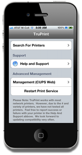 TruPrintMet de introductie van iOS 4.2 werd ook draadloos printen geïntroduceerd op de iPhone, iPod touch en iPad. Helaas bleek de ondersteuning van AirPrint beperkt tot een handje vol printers. De ontwikkelaars van Intelliborn (onder andere bekend van applicaties zoals MyWi, My3G en IntelliScreen) hebben dit gebrek op weten te lossen met de tweak TruPrint. Dankzij deze tweak is het mogelijk om draadloos te printen van iOS met de meeste netwerkprinters (ethernet of Wi-Fi). TruPrint zal op dit moment netwerkprinters automatisch herkennen als deze ondersteuning hebben voor Bonjour of SNMP of het een Canon netwerkprinter betreft (in het laatste geval moet je eerst de Canon iOS applicatie installeren). Het handmatig toevoegen van printers zou mogelijk moeten zijn voor gevorderde gebruikers via Management (CUPS Web). Printers die direct verbonden zijn aan een Airport Extreme worden niet ondersteund. Na het installeren van de tweak kun je het standaard Apple-menu gebruiken om te printen. Om gebruik te kunnen maken van TruPrint zul je moeten beschikken over iOS 4.2 of hoger. Gebruikers met Mac OSX 10.6.5+ kunnen ook gebruik maken van AirPrint Activator.