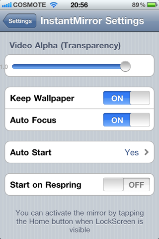 Instant Mirror is een tweak van de ontwikkelaar @Limneos waarmee je jouw iPhone 4 of 4e generatie iPod touch eenvoudig kunt gebruiken als spiegel. Wanneer je de Home-button indrukt om het lockscreen te tonen, zul je jezelf kunnen zien met behulp van de front-facing camera die in beide toestellen aanwezig is. Door de Home– en Sleep-knop beiden enkele seconden ingedrukt te houden kun je een screenshot maken. Instant Mirror is geschikt voor gebruik op iOS 4.0 en hoger.