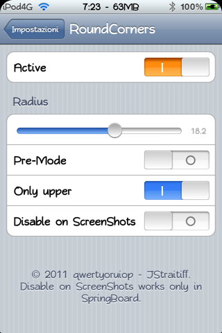 RoundCorners is een tweak waarmee je de vormgeving van iOS zo aan kunt passen dat er afgeronde hoeken worden weergegeven. Via het menu Instellingen kun je zelf kiezen in welke mate de hoeken moeten worden afgerond, of dit moet gebeuren zoals op de Palm Pre, of je dit zowel aan boven- als aan de onderkant wilt zien en of deze weergave uitgeschakeld moet worden als je een screenshot maakt. RoundCorners is geschikt voor gebruik op iOS 4.0 en hoger.