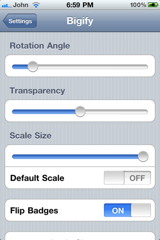 BigifyMet Bigify kun je de icoontjes op het SpringBoard van je iPhone, iPod touch of iPad naar hartenlust vergroten of juist verkleinen. Daarnaast kun je met de tweak de icoontjes roteren, achterstevoren weergeven of semi-transparant maken. De tweak voegt zelf geen icoontje toe aan SpringBoard. Je kunt Bigify instellen via het menu Instellingen. Om gebruik te kunnen maken van Bigify heb je tenminste iOS 4.0 of hoger nodig.