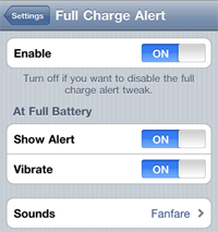 Full Charge AlertDe werking van Full Charge Alert is simpel en laat zich raden: je krijgt na installatie van de tweak een melding te zien als de batterij van je iDevice volledig is opgeladen. Je kunt er bij de laatste versie van Full Charge Alert voor kiezen of je de melding wilt krijgen wanneer je toestel volgens iOS 100% is opgeladen of wanneer deze écht zijn maximale capaciteit zou hebben bereikt. Daarnaast is het mogelijk om te kiezen uit een notificatie, vibratie of het afspelen van een vooraf in te stellen geluidsopname. Je kunt Full Charge Alert gebruiken in combinatie met iOS 3.0 of hoger.