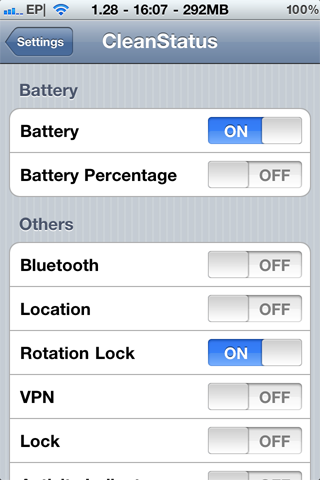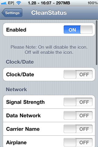 Met CleanStatus kun je de statusbalk op je iPhone, iPod touch of iPad opruimen. Na installatie van de tweak kun je namelijk voor 20 verschillende functies het bijbehorende icoontje in de statusbalk aan- of uitschakelen. Je kunt daarbij denken aan bijvoorbeeld de tijd en datum, signaalsterkte, naam van je operator, de batterijstatus, BlueTooth, GPS, rotatatielock, et cetera. Om gebruik te kunnen maken van CleanStatus heb je iOS 4.0 of hoger nodig en je kunt de tweak instellen via het menu Instellingen.
