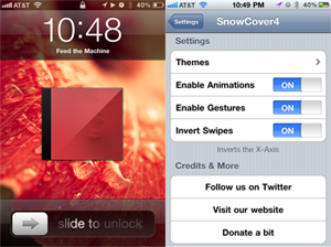 SnowCover4Je kunt SnowCover 4 gebruiken om met gebaren de muziek op het lockscreen te bedienen, maar daarnaast biedt de tweak een aantrekkelijke vormgeving voor de covert art op het lockscreen en de mogelijkheid om deze weergave met thema’s naar je eigen smaak in te richten. Je kunt thema’s voor de tweak in de map /Library/SC4Themes plaatsen en activeren via de instellingen van SnowCover4. De tweak is geschikt voor elke iPod touch en de iPhone 3GS en iPhone 4 op iOS 4.0 en hoger.