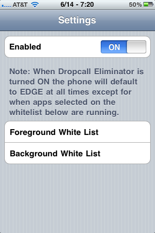 Als je vaak geconfronteerd wordt met verbroken verbindingen als je een gesprek probeert te voeren kan DropCall Eliminator misschien een oplossing bieden. De tweak is geschreven naar aanleiding van problematiek op het netwerk van AT&T, maar kan ook een oplossing bieden voor de gebrekkige 3G-netwerken van andere operators (en is getest met T-Mobile NL). Eenmaal geïnstalleerd zal DropCall Eliminator standaard gebruikmaken van het GSM-netwerk, tenzij er een applicatie die op je whitelist staat actief is op de voor- of achtergrond. DropCall Eliminator is geschikt voor de iPhone 3G, iPhone 3GS en iPhone 4.