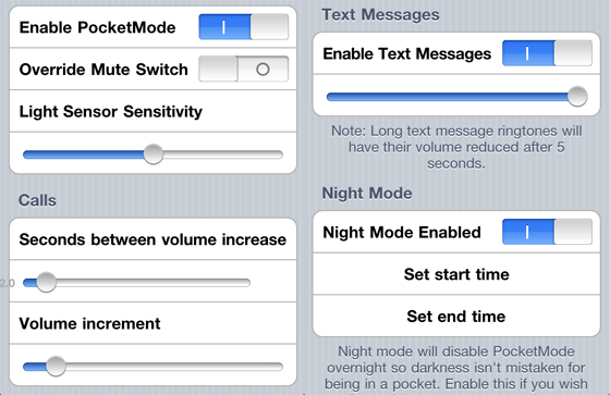 Pocketmode is een tweak die herkent wanneer je iPhone in je broekzak zit. Als je wordt gebeld of gesmst terwijl je iPhone in je broekzak zit kan het geluid daardoor steeds iets harder worden gezet. Je kunt er zelfs voor kiezen om het geluid steeds harder te laten horen als de knop voor het geluid op uit staat. Wanneer je de iPhone uit je zak haalt zal het geluid teruggaan naar het originele niveau. Om ervoor te zorgen dat de tweak niet per ongeluk ’s nachts geactiveerd wordt, kun je gebruik maken van de Night Mode. Pocketmode is geschikt voor alle iPhones op iOS 4.