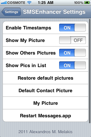 Met SMSEnhancer kun je de weergave van smsjes in de standaard Berichten-applicatie wat uitbreiden. Meer specifiek stelt SMSEnhancer je in staat om een foto weer te geven van je contacten en om altijd een tijd weer te geven bij smsjes die je hebt verstuurd of ontvangen. SMSEnhancer is in te stellen via het menu Instellingen en vereist een iPhone met iOS 4 of hoger.