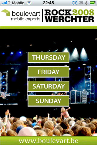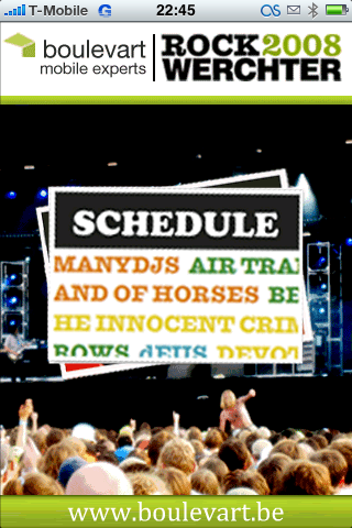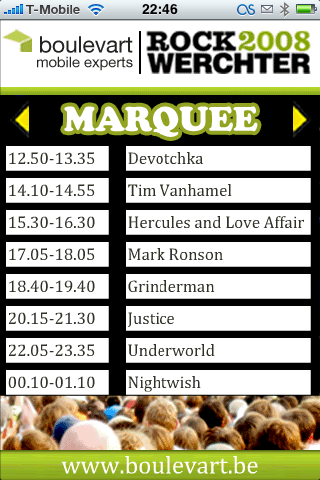 Het programma van de Main Stage.Dit weekend vindt in België het festival Rock Werchter plaats. Nu is het probleem met dit soort festivals dat je nooit precies weet wanneer welke artiest op welk moment gaat optreden. En omdat er meerdere podia zijn is de kans groot dat je op het juiste moment op de verkeerde plek staat. De mannen van webbureau Boulevart hebben er iets op verzonnen: de Rock Werchter Mobile Guide. Daarmee kun je op je iPhone (en op je Nokia) checken welke artiesten gaan optreden.