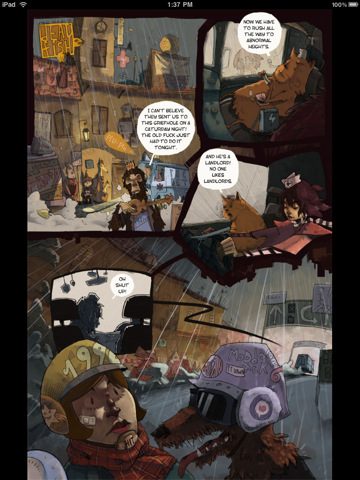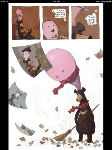 Er zijn in totaal vier strips beschikbaar in de app: A Cave, Dead Fish, Pancakes en The Lonely Bear. Hierin zie je onder andere een beer en zijn bevriende hersenkanker, een vis op het droge en een werkplek voor de bijna overledenen. The Lonely Bear krijg je cadeau wanneer je de app aanschaft. Wil je de rest kopen, dan kan dit voor 79 cent per stuk. Er is ook een bonusstrip voor diezelfde prijs beschikbaar, met daarin een paar strips van een pagina.