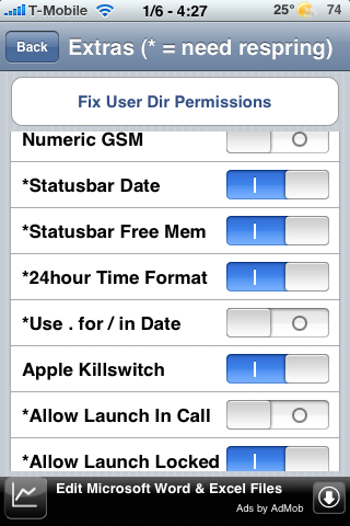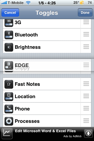 Naast het weergeven van de datum kun je ook het aantal MB’s vrij geheugen op je statusbalk laten zien. Zo kun je van tevoren bekijken of je eerst even moet herstarten alvorens die veeleisende applicatie op te starten. De volgorde waarin de schakelaars worden getoond is nu aanpasbaar en je kunt SBSettings nu ook gebruiken vanaf je lockscreen.