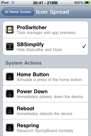 Activeren is inderdaad heel erg simpel maar deactiveren werkte bij mij nogal omslachtig. Ik had 2x Tap statusbar aangevinkt, statusbar en dock verdwenen ook meteen na 2 taps. De statusbar blijft overigens steeds blauwachtig opgloeien nadat je SBSimplify geinstalleerd hebt.