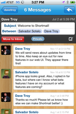 Lange e-mailberichten lezen kost veel tijd, helemaal als je je ook nog verplicht voelt om een antwoord van drie kantjes terug te sturen. Shortmail heeft daarom een andere insteek: korte berichtjes om met anderen te communiceren. Twitter is daarvoor met z’n 140 tekens nét iets te beknopt. Vandaar dat Shortmail je uitdaagt om je boodschap niet langer te maken dan 500 tekens. Het voorkomt e-mail overload en e-mailwisselingen worden daardoor meer een gesprek en het kost minder tijd om e-mail door te lezen. De nieuwe app Shortmail voor iPhone maakt het mogelijk.