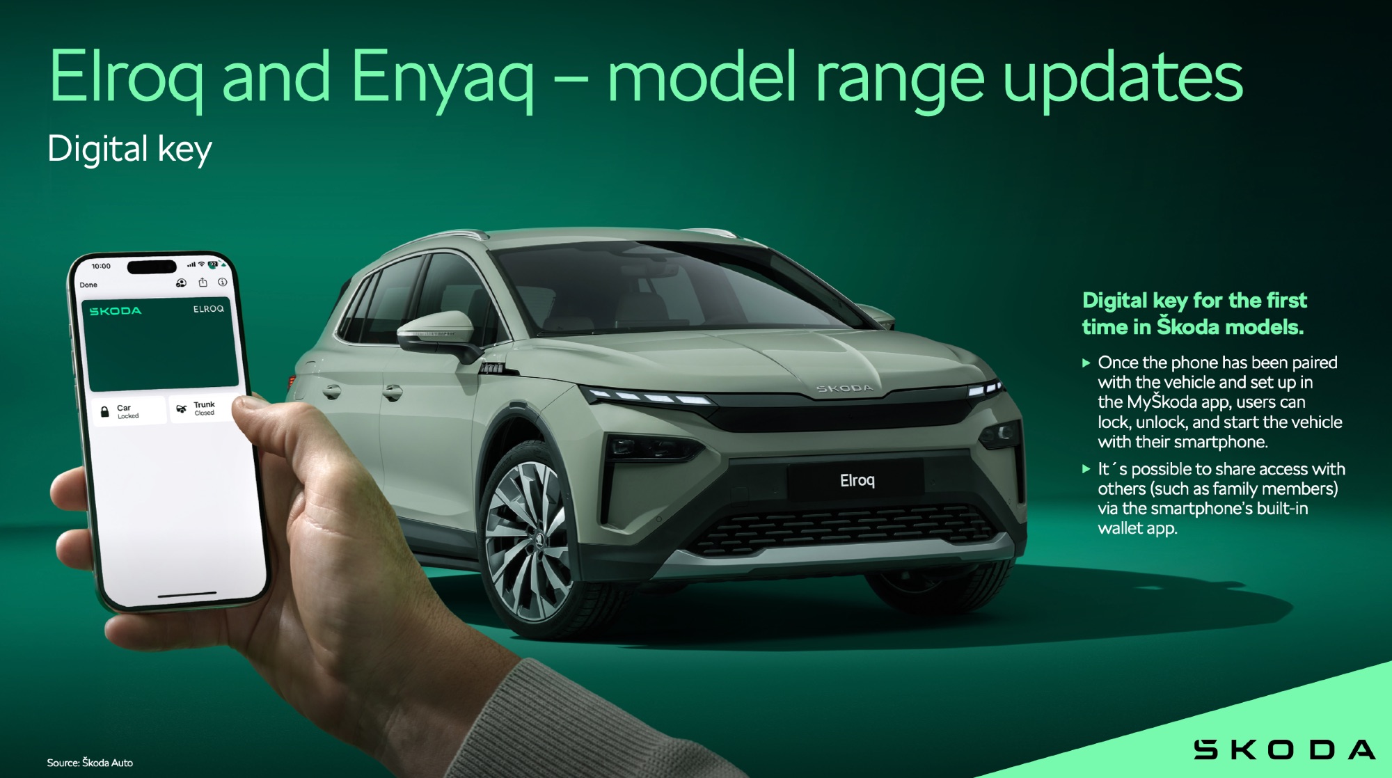 In een persbericht heeft Skoda de nieuwste uitvoeringen van de Elroq en Enyaq aangekondigd, twee volledig elektrische auto’s. Deze twee modellen zijn in Europa heel erg populair en midden 2026 komt Skoda met geüpdatet versies. Voor Apple-gebruikers zijn er twee interessante vernieuwingen. De meest interessante is dus de ondersteuning voor de Digital Key-functie. Hiermee kan je de auto ontgrendelen en starten met een digitale autosleutel in Apple’s Wallet-app. Je kunt deze sleutel ook gebruiken om de achterbak te openen.