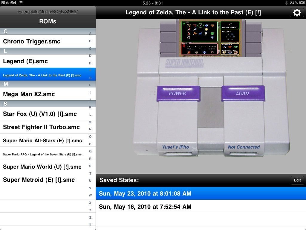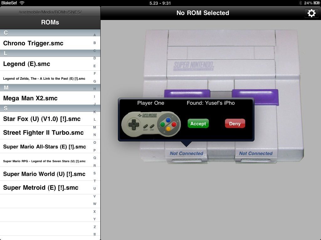 Wanneer je eenmaal een aantal ROMs in de juiste directory op je iPad hebt geplaatst controleer je eerst of Bluetooth is ingeschakeld op je iPad en iPhone. Selecteer vervolgens SNES HD op je iPad en ControlPad op je iPhone. Je iPad en iPhone zullen verbinding met elkaar proberen te maken en als het goed is verschijnt daarbij de tekst Tap to Connect op je iPhone. Selecteer daaronder je iPad en kies vervolgens voor Accept op je iPad. Daarna hoef je alleen nog maar een keuze te maken uit de ROMs aan de linkerkant en vervolgens op de Power knop op het scherm te drukken.