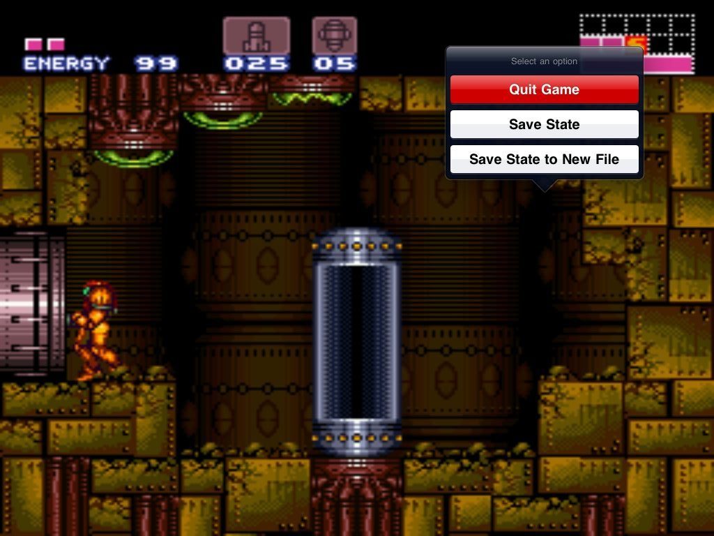 Tijdens het spelen van een spel kun je double-tappen op het scherm van je iPad voor het Save/Quit menu. Als je kiest voor Save zal er een screenshot van het scherm worden gemaakt, die zal worden weergegeven wanneer je op een later moment terug wilt keren naar hetzelfde punt. Je kunt dit doen door in het scherm waarop de console wordt weergegeven een Saved State te selecteren (die dan blauw wordt weergegeven) en vervolgens in plaats van Power te kiezen voor Load.