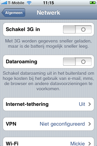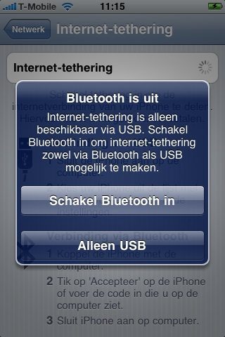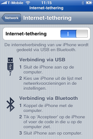 7. Als je nu naar Instellingen > Algemeen > Netwerk gaat zien T Mobile-klanten een nieuwe optie, namelijk internet-tethering (plaatje 7). Simlockvrije iPhones hadden deze optie al. Als je tethering aanzet kan je zowel via Bluetooth en USB je iPhone als modem gebruiken (plaatje 8 en 9).