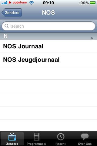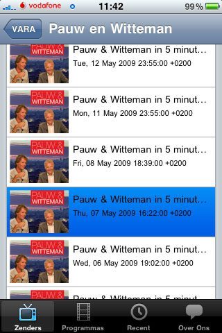 Omdat mijn eigen previewversie niet te installeren bleek en de ontwikkelaar op vakantie is, was Raimond van osxmobile.nl zo aardig om een berg screenshots te sturen van de previewversie. Daaruit blijkt, dat het met regelen van tv-rechten uiteindelijk niet gelukt is: de lijst met programma’s verschilt eigenlijk niet zoveel van de eerder verschenen applicatie Mobinews (€2,99). Beide applicaties bieden in feite deeplinks naar videopodcasts, YouTube-content en internet-programma’s die je zonder toestemming van de omroepen in een applicatie mag stoppen. Zo bevat de applicatie samenvattingen van Knevel & Van den Brink en Pauw & Witteman, maar niet de volledige uitzendingen. Of dat ook geldt voor de filmpjes van bijvoorbeeld Jiskefet en Bananasplit mag de juridische afdeling van de omroepen uitzoeken. Een volledige lijst met programma’s is via deze RSS-feed te lezen.