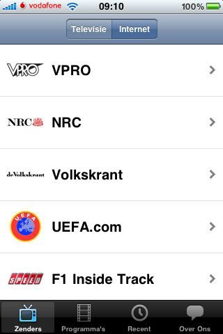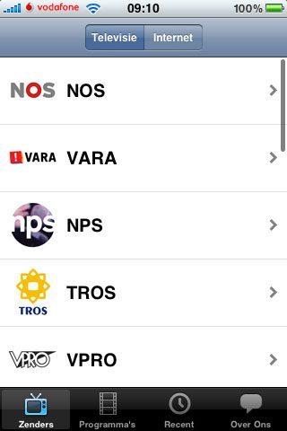 De applicatie bevat bovenin het scherm twee knoppen: televisie en internet. Kies je voor televisie, dan krijg je een lijst van de omroepen te zien. Kies je bijvoorbeeld NOS, dan heb je de keuze uit het gewone NOS Journaal en het Jeugdjournaal. Bij de TROS heb je de keuze uit programma’s, die je ook al met de gratis applicatie TROS Gemist kunt bekijken. Bij TROS Gemist kun je de programma’s ook offline opslaan op je iPhone; bij TV Gemist kan dat niet.