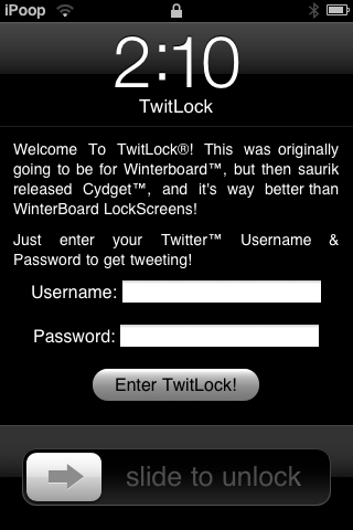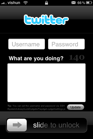 Van de verschillende oplossingen om Twitter op je lockscreen te gebruiken is Twydget v1.2 de enige die een simpele maar volledige Twitter-client met je lockscreen integreert. Met deze Twitter-client kun je onder andere tweeten, status updates van je vrienden en @replies bekijken. Ben je halverwege een tweet en wordt je iPhone of iPod touch gelockt, dan zul je de tekst die je hebt getypt niet kwijt raken. Gevorderde gebruikers kunnen zelf /System/Library/LockCydgets/Twydget.cydget/settings.js editen om bijvoorbeeld de standaard achtergrond te wijzigen of om de inloggegevens permanent op te slaan. Twydget is gratis beschikbaar in de repository van BigBoss.