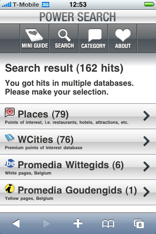 POI staat voor Point Of Interest, oftewel interessante plaatsen. In navigatiesystemen zijn meestal honderden tot wel duizenden POI’s meegeleverd, zodat je makkelijk het dichtstbijzijnde tankstation of hotel kunt vinden. Op de iPhone heeft navigatieleverancier Wayfinder een oplossing bedacht, die al een paar maanden bestaat maar eigenlijk nauwelijks aandacht heeft gekregen: Wayfinder Power Search.