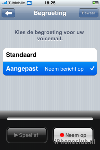 In plaats van een gesproken menu moet je bij Visual Voicemail een aantal schermen doorwerken. Daarbij kun je kiezen voor een standaard of aangepaste begroeting, waarbij je via een opnameknop op het scherm je persoonlijke welkomstwoord kunt inspreken. Voicemailberichten komen zoals beloofd in volgorde binnen waarna je ze in elke gewenste volgorde kunt beluisteren. Reeds beluisterde berichten kun je verwijderen. Ze komen dan in een soort prullenbak terecht, waar je ze ook definitief kunt wissen met de knop Wis alles.