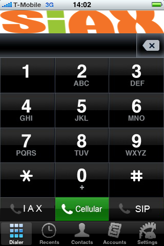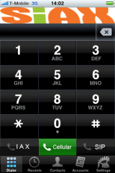 - Het belpaneel van Siax, met onderin de knoppen voor IAX, SIP en gewoon bellen (GSM).