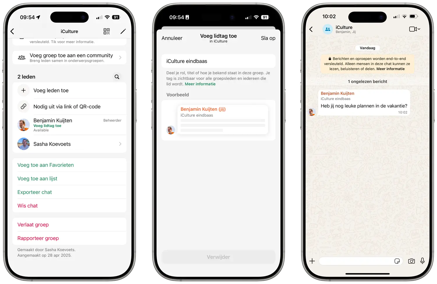 De functie werkt alleen goed als iedereen voor zichzelf zo’n tag toevoegt. De tag is vervolgens zichtbaar in het overzicht van groepsleden, maar wordt ook bij elk chatbericht verstuurd. Je kunt een lidtag per groep voor jezelf toevoegen. Zo kun je dus een aparte tag voor de sportclub van je kind en het groepsgesprek van je werk instellen.