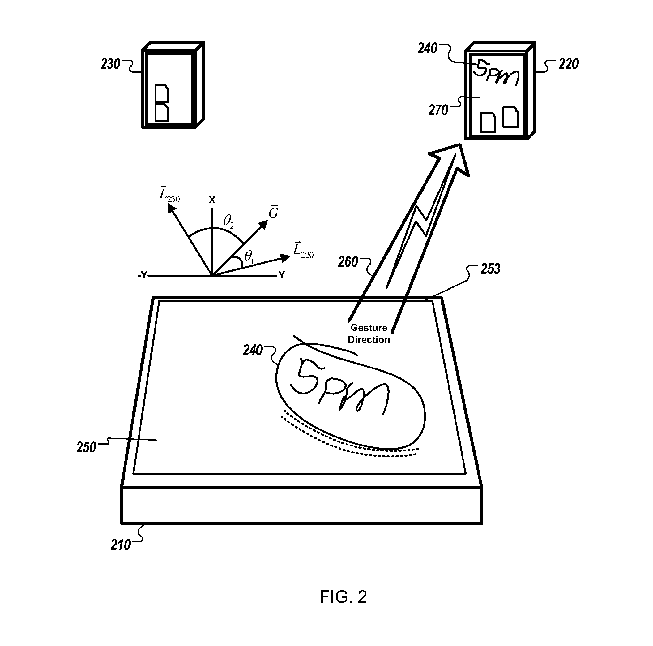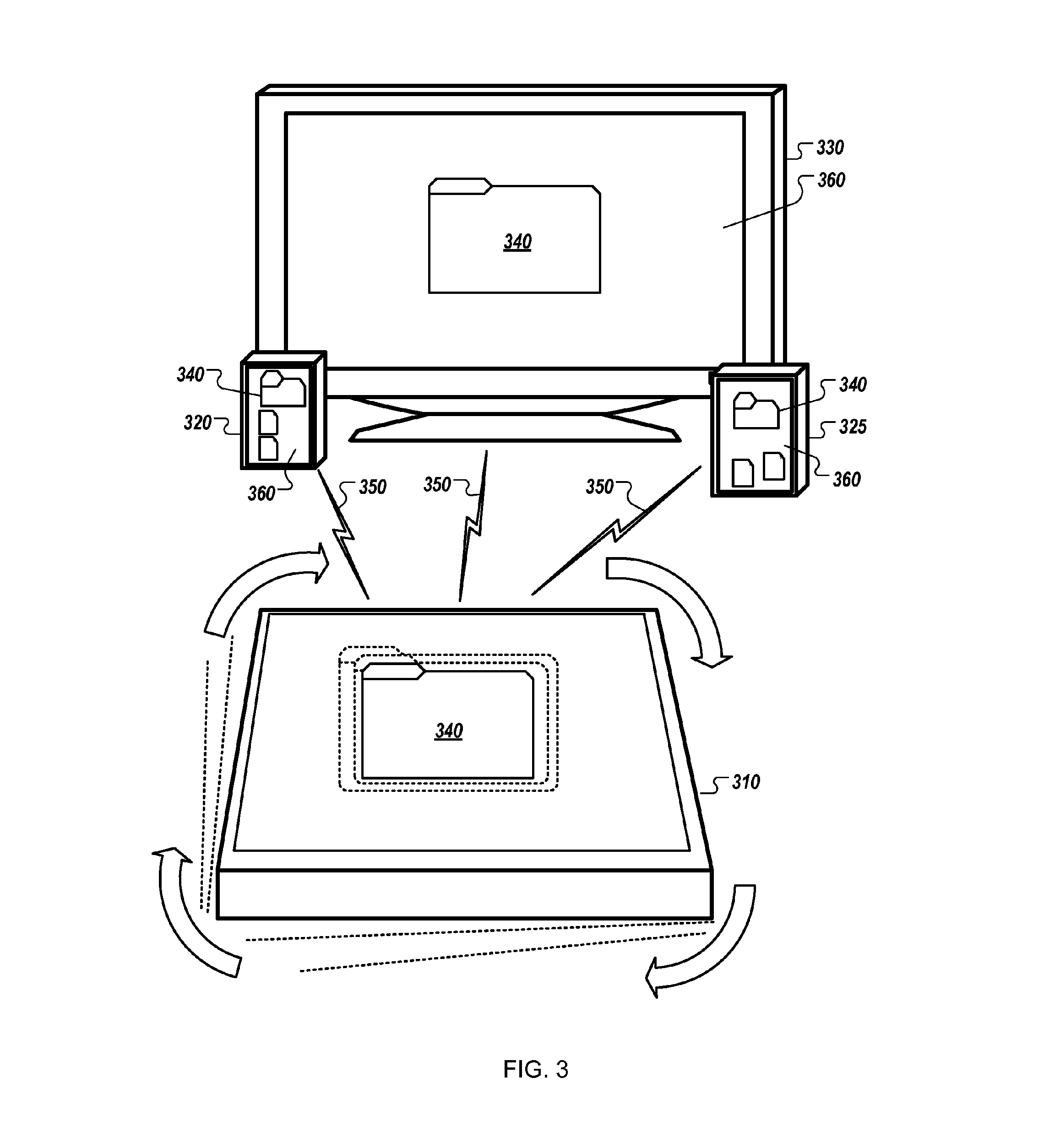 Het patent beschrijft de mogelijkheid om bestanden naar een andere iPhone of iPad te ‘gooien’ met een vingerbeweging op de touchscreen. Het apparaat ziet dan aan de hand van het kompas en gps waar de ander zich bevindt, om zo te voorkomen dat bestanden verkeerd landen. Nog een idee in het patent gaat over het overgieten van bestanden. Je legt de ontvanger plat op tafel, waarna je het versturende toestel er overheen schuin houdt. Hierbij zou je het geluid van bijvoorbeeld lopend water horen. Bij een derde voorbeeld spreekt Apple over het delen met iedereen in dezelfde ruimte door je iPad te roteren, alsof je een frisbee gooit.