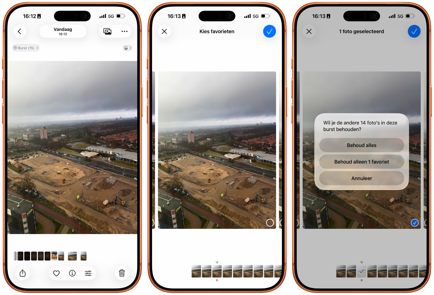 Druk je op het vinkje, dan kun je alle andere foto’s uit de reeks weggooien, maar je kunt ze eventueel ook bewaren. Om te voorkomen dat je iPhone-opslag vol raakt kun je het beste alleen de favorieten bewaren en de rest weggooien.