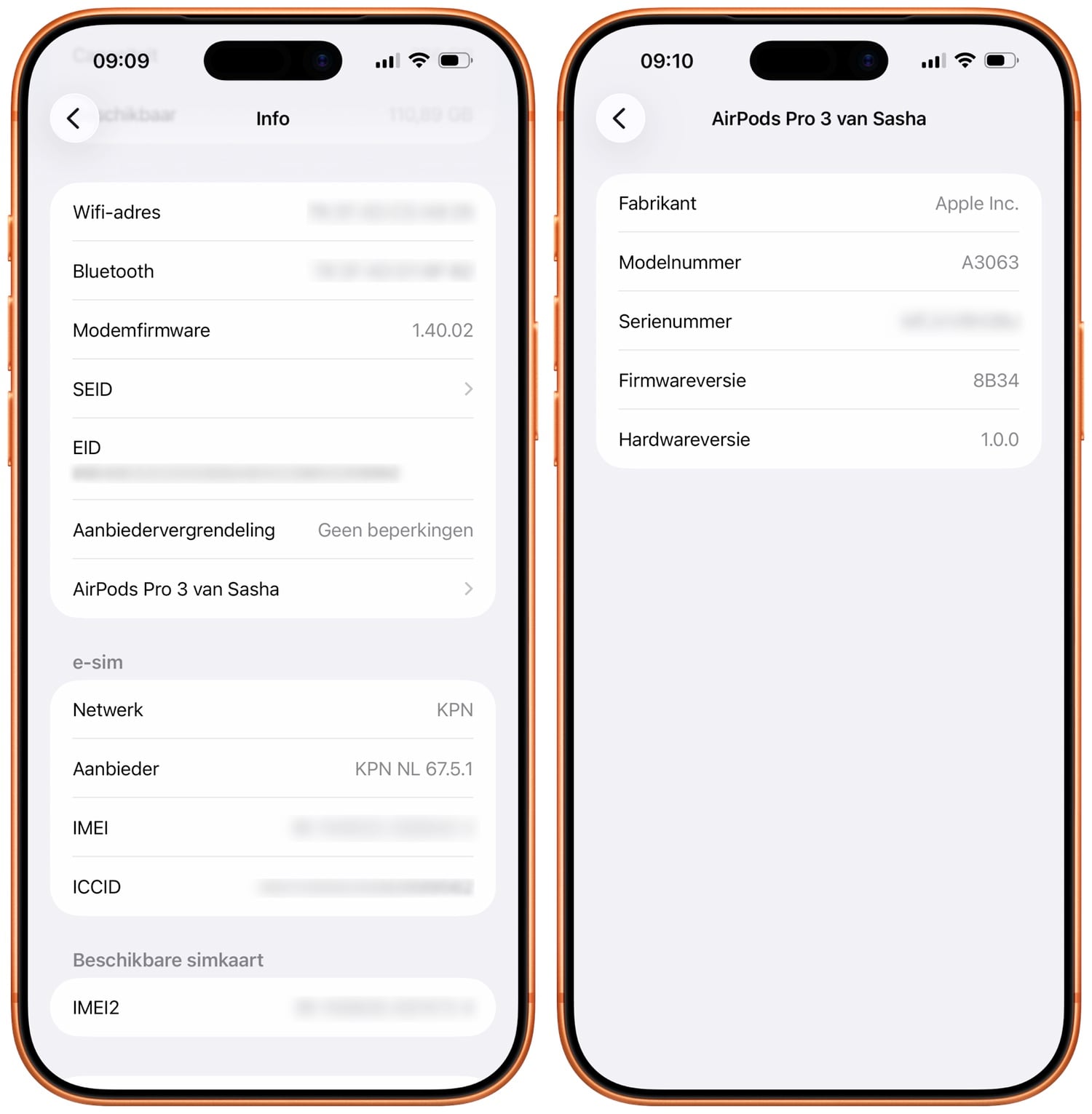 Als alternatieve manier kun je ook naar Instellingen > naam van je AirPods gaan en naar het Info-kopje scrollen.