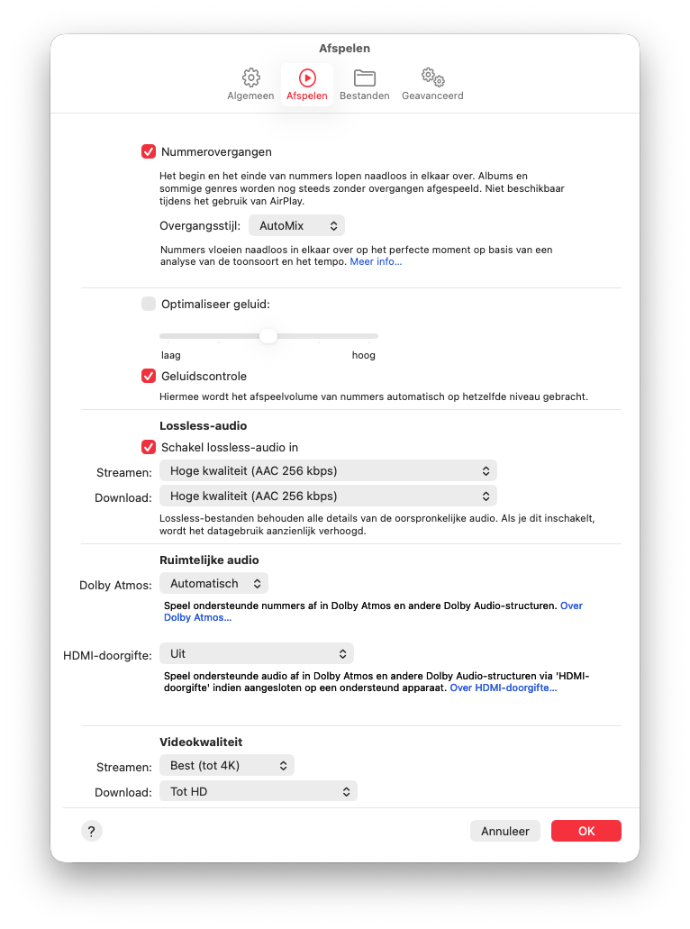 Om muziek met ruimtelijke audio af te spelen, moet je in sommige gevallen dus wat instellingen aanpassen. Controleer dan of alles goed ingesteld staat: