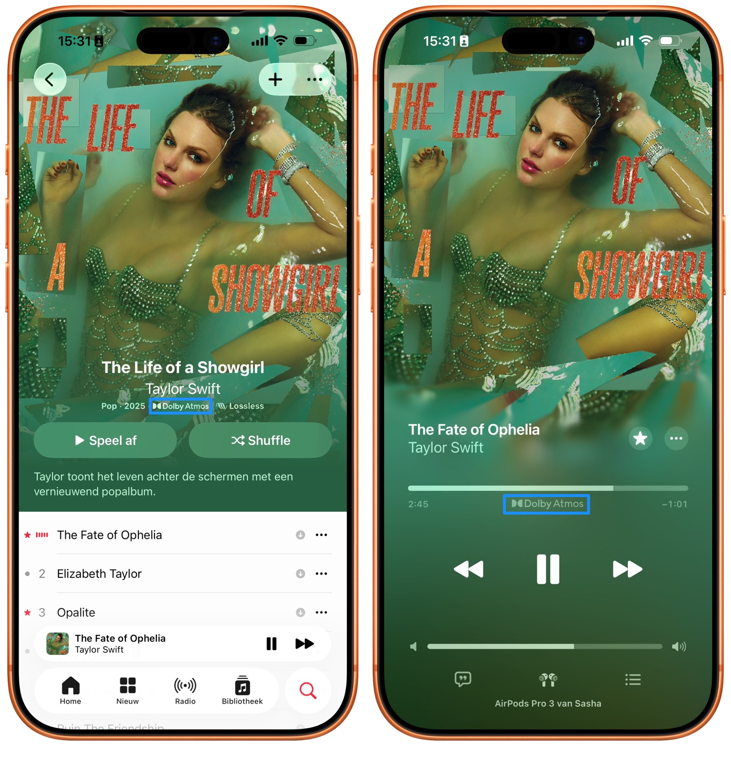 Als je aan de vereisten voldoet en alles goed is ingesteld, gaat het luisteren naar Dolby Atmos vrijwel automatisch. Je hoeft alleen maar een geschikt nummer te zoeken om de muziek met ruimtelijke audio af te spelen. Nummers spelen net als alle andere nummers gewoon af via de Muziek-app en zijn ook gewoon in afspeellijsten te plaatsen, aan je bibliotheek toe te voegen en te liken.