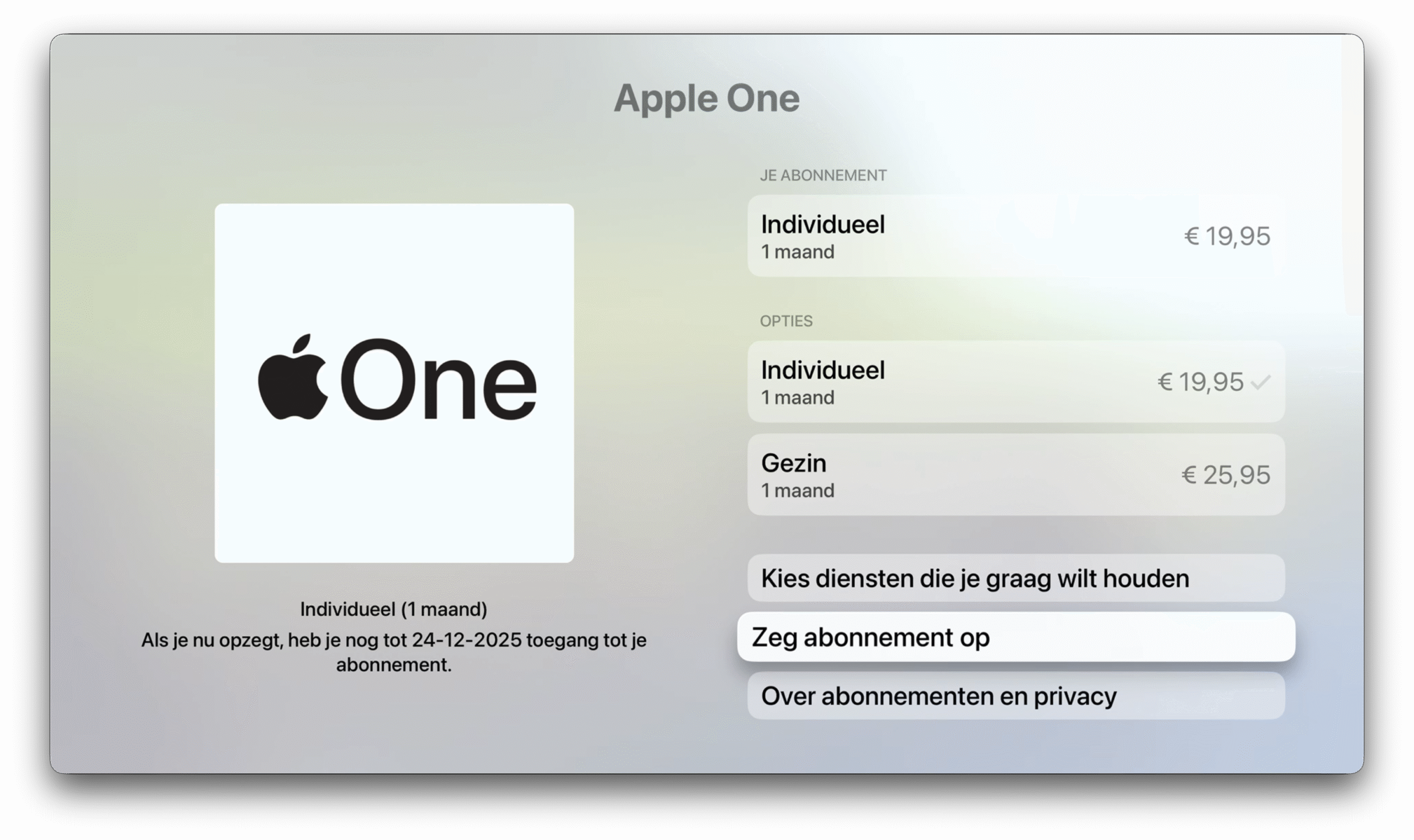 Als je toch wil blijven kijken, maar €9,99 per maand te duur vindt, zou je ook Apple One kunnen overwegen. Dat is een alles-in-één bundel waarin meerdere Apple-diensten gecombineerd zijn. Je hebt twee opties: individueel en gezin. In individueel zitten Apple Music, Apple Arcade, Apple TV en 50 GB iCloud-opslag voor €19,95 per maand. Apple Arcade en Apple TV zijn in dat geval ook met gezinsleden te delen. Wil je ook Apple Music en 200 GB iCloud-opslag delen met gezinsleden, dan kun je kiezen voor de gezinsbundel van €25,95 per maand.
