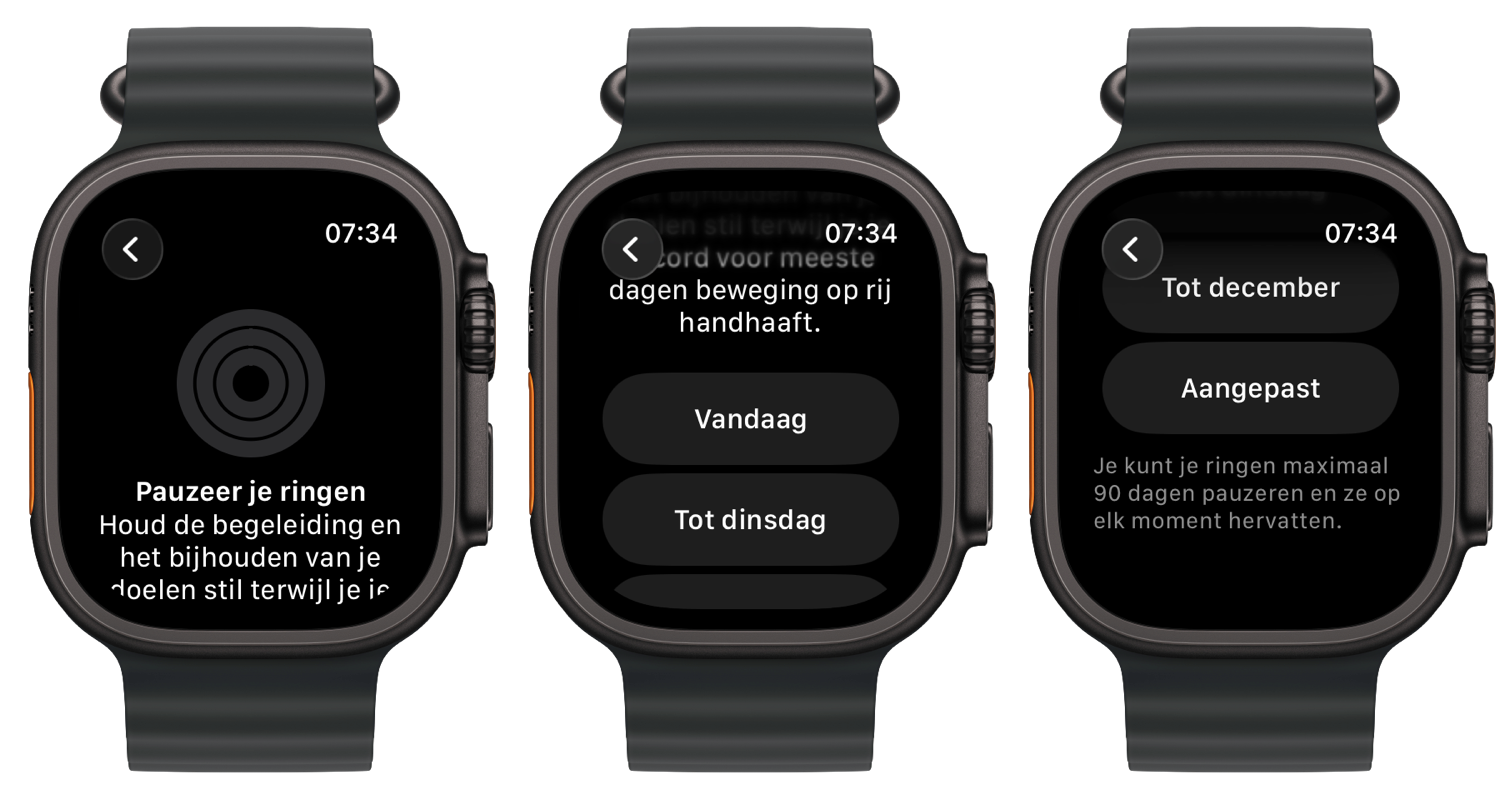 Je kunt je Apple Watch-ringen maximaal negentig aaneengesloten dagen achter elkaar pauzeren. Wil je langer pauzeren, dan moet je de stappen dus weer opnieuw instellen.