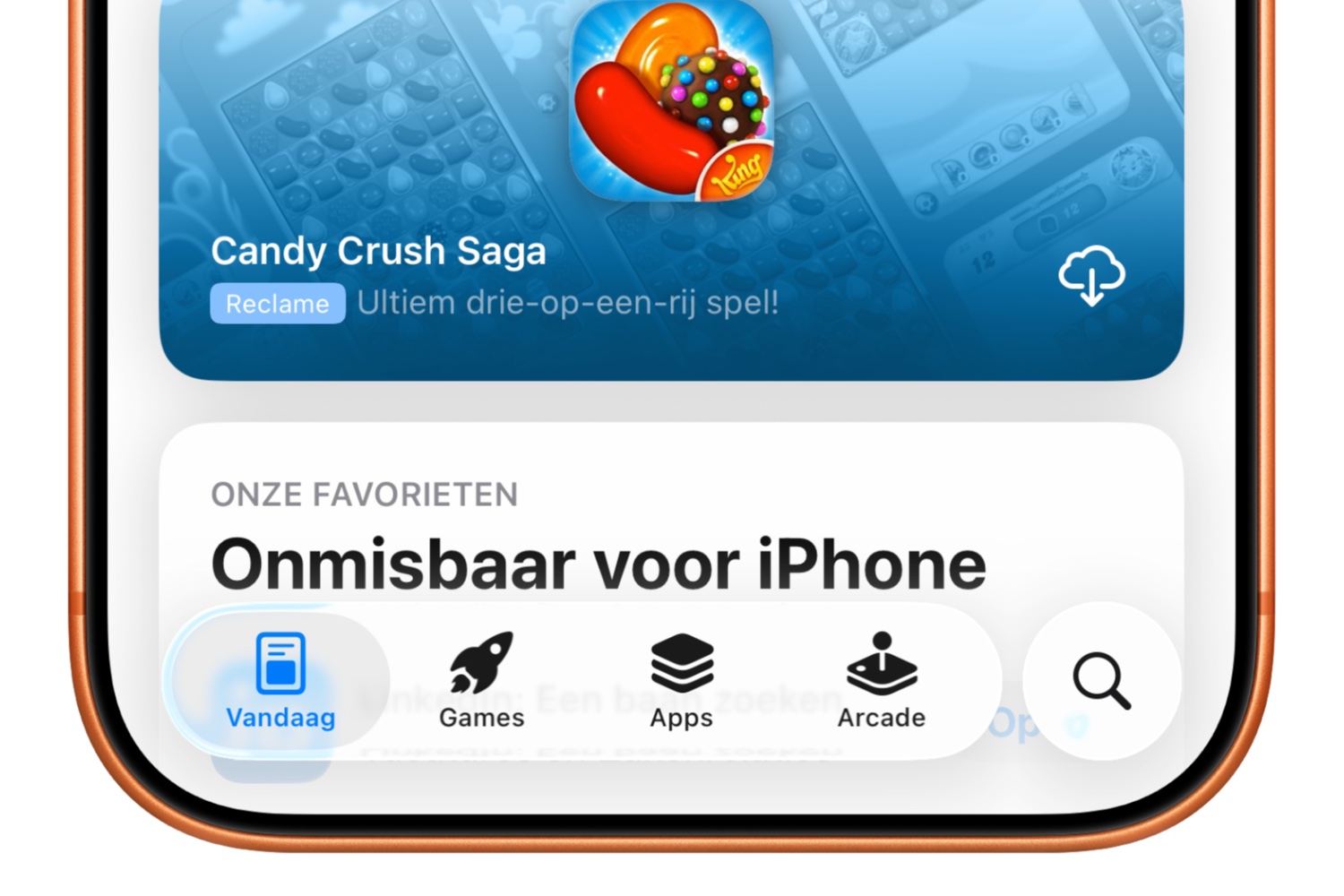 In de onderste balk van de app zie je verschillende tabbladen en knoppen staan: Vandaag, Games, Apps, Arcade en Zoek. Dit zijn hun functies: