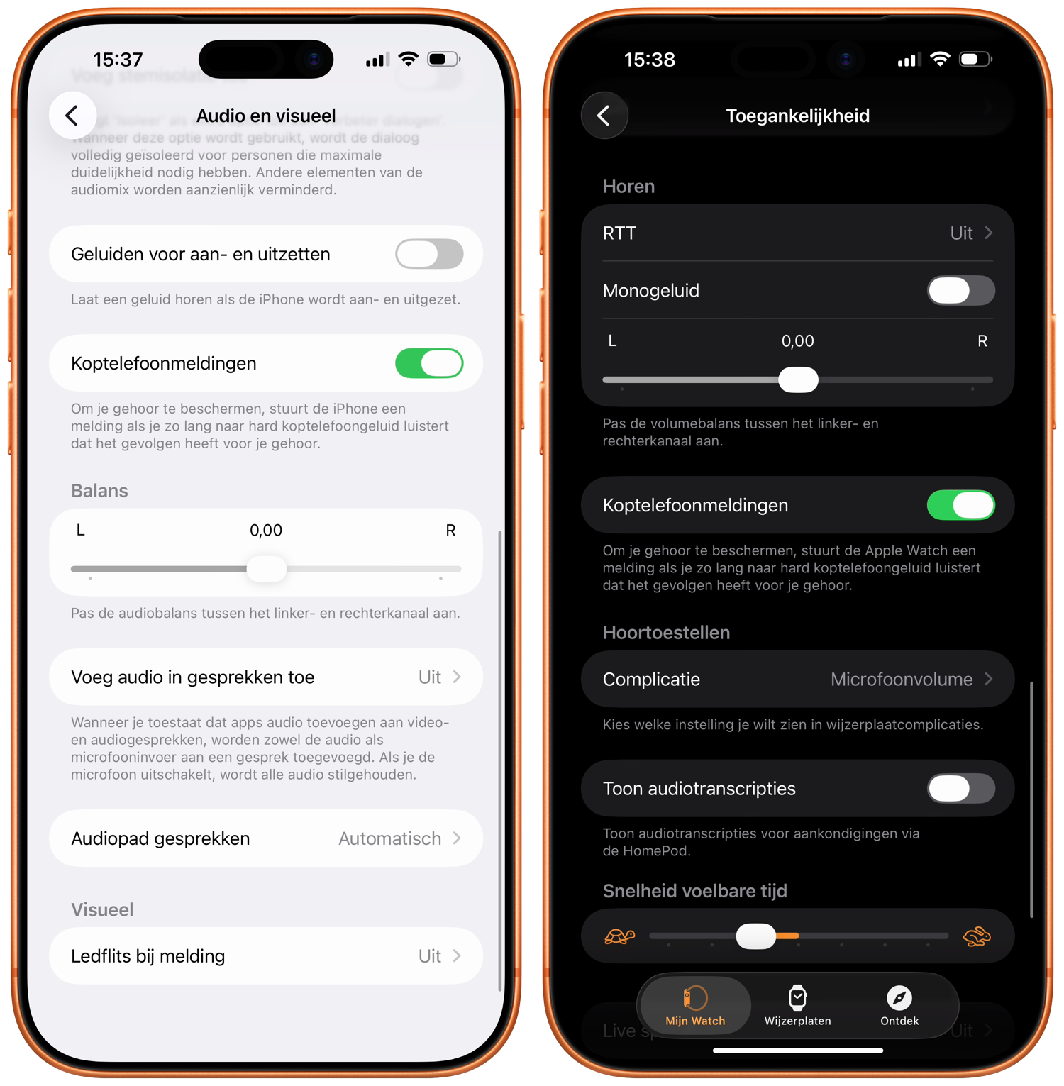 Wil je ook de audiobalans op je Apple Watch aanpassen, dan zul je dit apart van je iPhone moeten doen. De iPhone en Apple Watch synchroniseren deze instelling namelijk niet. Je zult de audiobalans moeten wijzigen in de Watch-app op je iPhone, dus niet op je Apple Watch zelf.