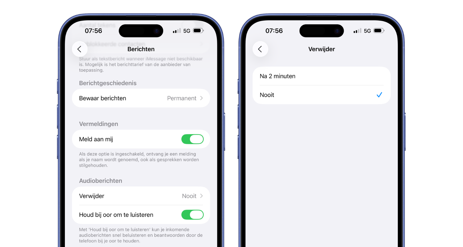 Het is jammer dat de keuze bij audioberichten zo beperkt is. Hopelijk voegt Apple net als bij tekstberichten nog andere opties toe, zoals 1 dag, 1 week of 6 maanden.