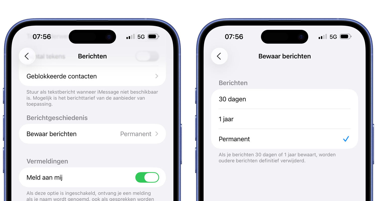- Kies de optie Na 2 minuten. De andere optie is afhankelijk van de instelling die je bij het bewaren van berichten ingesteld hebt. De optie Nooit verschijnt als je bij de tekstberichten Permanent aangevinkt hebt, terwijl de optie Na 1 jaar alleen zichtbaar is bij dezelfde instelling bij tekstberichten.