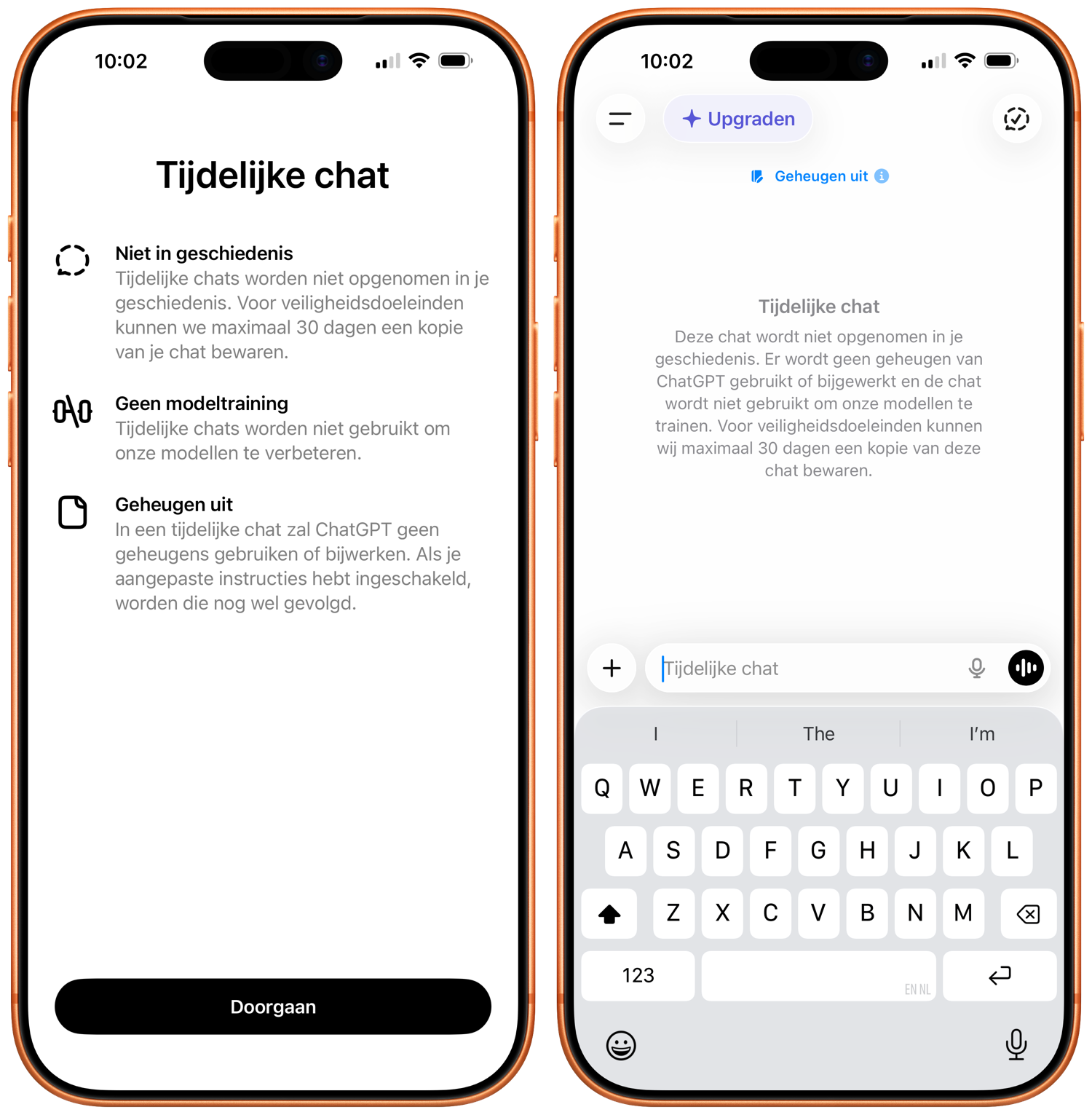 Daarnaast bieden sommige chatbots een tijdelijke of anonieme modus, vergelijkbaar met de incognito‑stand in je browser. In ChatGPT heet dat Tijdelijke chat: gesprekken verschijnen niet in je geschiedenis en worden niet gebruikt voor training. Handig voor onderwerpen die je niet blijvend aan je profiel wilt koppelen.
