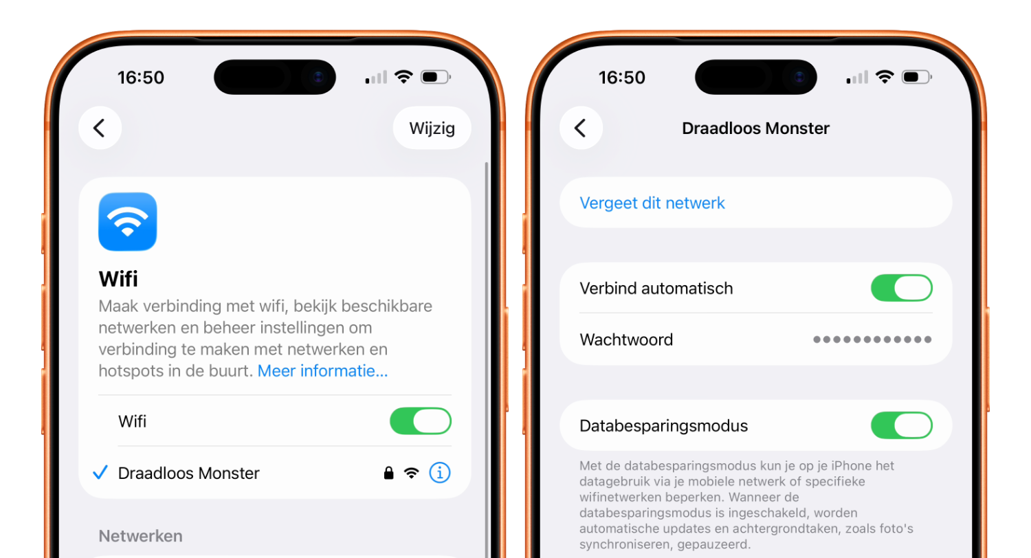 De databesparingsmodus wordt ook automatisch geactiveerd bij het gebruik van de persoonlijke hotspot. Je kan dit uitschakelen door op het apparaat waar je de internetverbinding op nodig hebt (bijvoorbeeld een iPad) naar Instellingen > Wifi te gaan en dan op het i’tje te tikken achter de iPhone waar je mee verbindt. Daar kun je vervolgens de Databesparingsmodus uitschakelen.