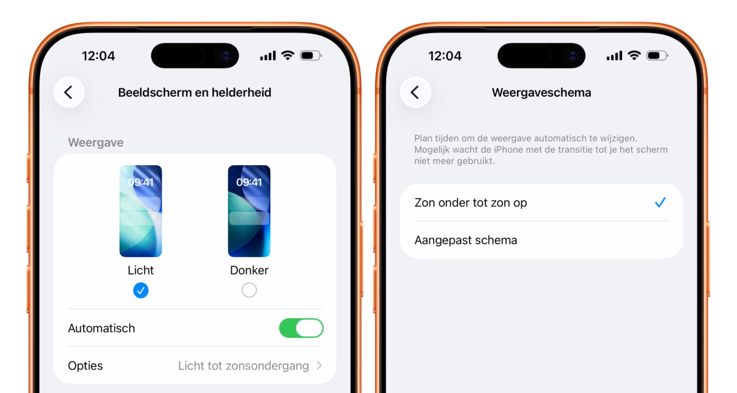 Heb je liever dat de donkere modus automatisch wordt ingeschakeld, dan kan dat ook. Je kunt zelf een schema instellen. Dat kan op basis van specifieke tijden, maar ook op basis van de zonnestand. Zo zal de donkere modus automatisch inschakelen als de zon onder gaat. In de zomer is je iPhone dan ook langer ingesteld op de lichte modus. Zo stel je het in: