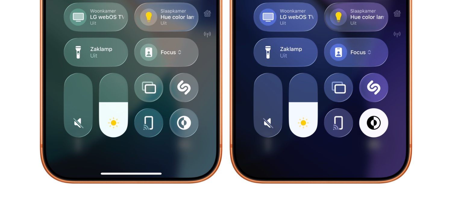Je kunt ook de dark mode inschakelen via het Bedieningspaneel. Hiervoor open je het Bedieningspaneel en tik je op het licht-donker-symbool. De weergave zal dan meteen worden aangepast. Waar dit symbool staat, is afhankelijk van de indeling van jouw Bedieningspaneel. Als je het automatisch in- en uitschakelen van de donkere modus gebruikt (zoals hieronder wordt uitgelegd), dan kun je met deze knop toch de weergave wisselen van licht naar donker en terug.