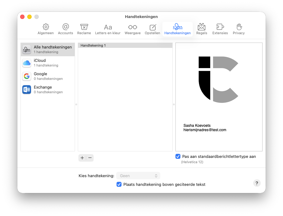 CMD + Tkun je de opmaak wijzigen (bijvoorbeeld dik gedrukt). - Heb je meerdere handtekeningen voor een account, dan kun je bij Kies handtekening instellen welke standaard gebruikt wordt voor het desbetreffende account.