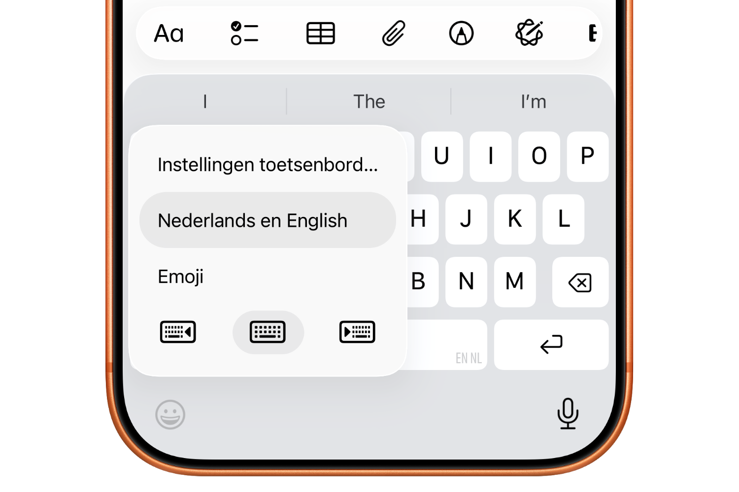 In liggende weergave is het speciale toetsenbordje niet beschikbaar, maar dat is ook logisch. Als je je iPhone in landscape vasthoudt, doe je dat meestal om een filmpje te kijken, niet om teksten te typen. Ook is het eenhandige toetsenbordje niet beschikbaar op iPhones met ingezoomd scherm en op iPads. Je hebt op de iPad wel een gesplitst toetsenbord om met twee duimen te kunnen tikken.