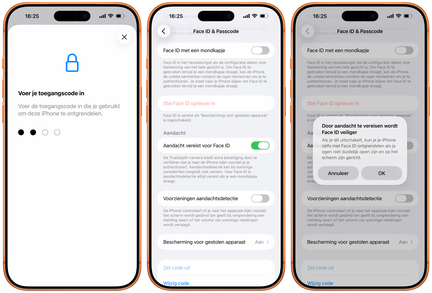 Behalve naar je ogen kijkt Face ID ook naar andere gezichtskenmerken, zoals je mond. Het is mogelijk om Face ID met mondkapje te gebruiken, maar ook dit is minder veilig. Combineer je beide methoden, dan is het nóg minder veilig en kun je beter gebruik maken van een simpele toegangscode. Je kunt namelijk Face ID uitschakelen.