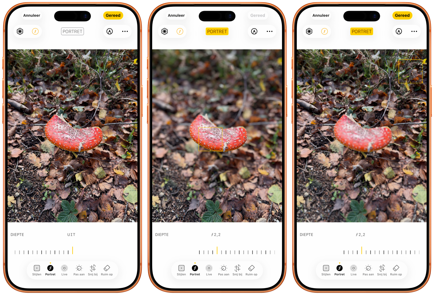 - Je kunt de dieptefunctie ook helemaal uitschakelen door de slider naar UIT te verplaatsen of door op de gele knop ‘Portret’ bovenin het scherm te tikken.