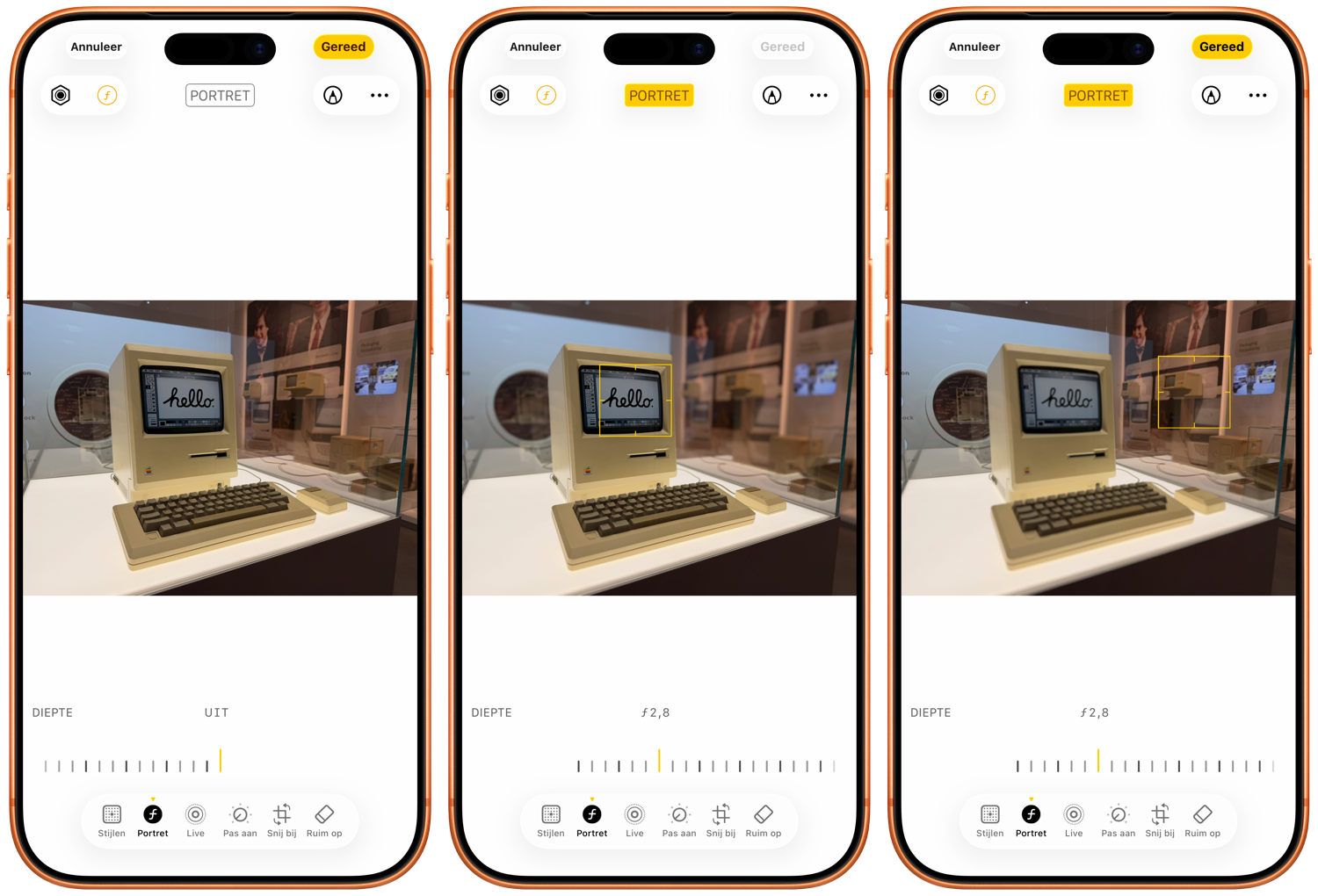 Apple Macintosh in het Apple Museum in Utrecht. Links geen diepte-effect, in het midden focus op de Macintosh en rechts focus op de achtergrond.